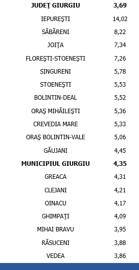 Conform informării transmise de Prefectura Giurgiu, incidența cumulată la 14 zile, la data de 27.01.2022 se prezintă astfel, acestea fiind cele mai mari valori: