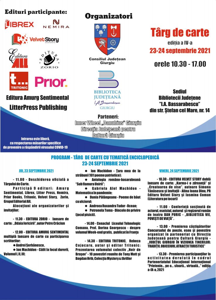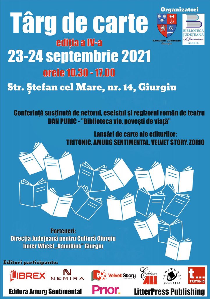 În zilele de 24 și 25 septembrie 2021 , Biblioteca Județeană I.A Bassarabescu” organizează cea de-a IV-a ediție a Târgului de Carte, manifestare în cadrul căreia vor avea loc lansări de carte ale editurilor Tritonic, Amurg Sentimental, Velvet Stori, Zorio.