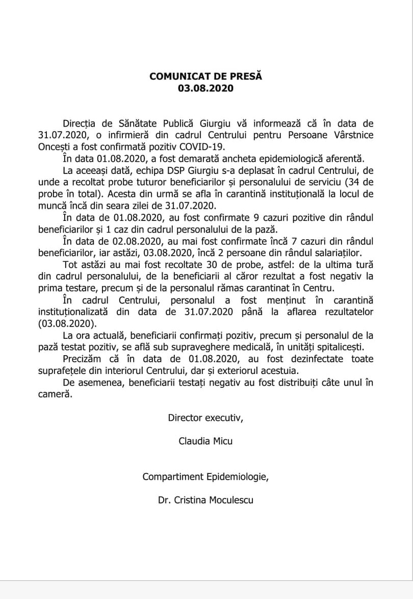 Este adevărat că direcția a pregătit o persoană în sensul recoltării de probe, după cum ne-au spus sursele noastre, dar având în vedere gravitatea situației s-a temut să nu vicieze probele și atunci au insistat ca ele să fie recoltate de personal specializat din cadrul DSP Giurgiu, lucru care, conform comunicatului s-a întâmplat pe data de 1 august 2020.